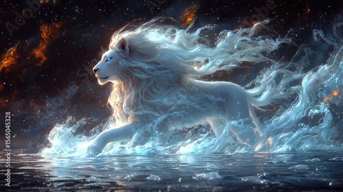 vibrant, cosmic, creature, animal, celestial, aethereal, energy, eye, mystical, white, fantasy, art, lion, flowing, aglow, blue, spirit, mane, powerful, majestic, design, beauty, mythical, water, illustration, movement, nature, light, abstract, digital