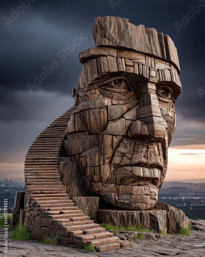 sculpture, wooden, face, art, stair, step, expression, nature, heritage, creativity, landscape, craftsmanship, sky, architecture, artistic, historical building, detailed, design, texture, culture, history, stone, formation, natural, unique, installation, silhouette, beauty, minimalist, serene, viewpoint, visual, wood, large, imaginary, lighting, scene, perspective, monumental, artisan, character, environment, structure