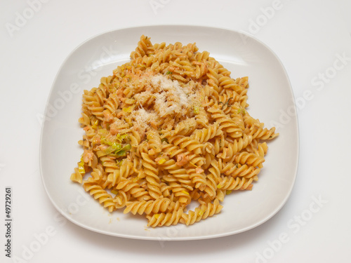 noodle, plate, cheese, salmon, fusilli, leek, dill, cream, isolated, delicious, dish, dinner, meal, supper