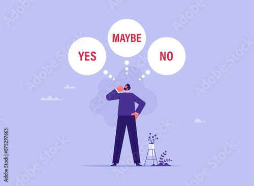 Makes important decision concept, standing among inscriptions yes and no or maybe, businessman makes a choice or makes a decision with bubbles and text yes, no, maybe