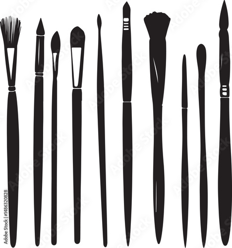 brush, tool, make-up, art, silhouette, black, white, studio, beauty, cosmetic, design, paint, drawing, illustration, texture, shape, line, detail, craft, elegant, simple, clean, modern, style, object, equipment, application, collection, accessory, creative