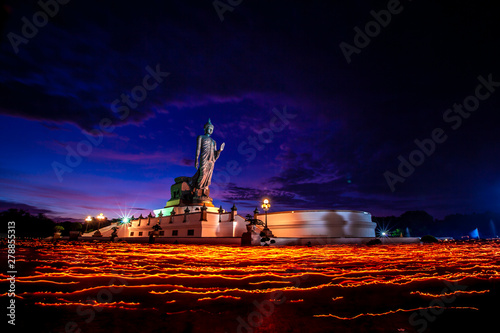 Makha Bucha Day in Thailand , Candle lit from buddhists are moving around Buddha statue at the Phutthamonthon district, Nakhon Pathom, Thailand.