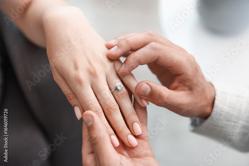 Making proposal. Man putting engagement ring on his girlfriend's finger indoors, closeup