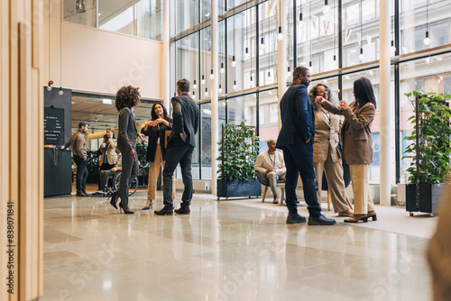 Male and female business entrepreneurs discussing with each other during networking event at convention center