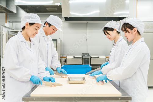 butchering, preparation, cook, food processing, kitchen, chef, food, cooking, processing, eatery, ingredient, staff, supermarket, chef's hat, backyard, work, craftsman, man, woman, training, uniform, business, japanese, asian, chinese, indoor, person, chicken, meat, butcher shop