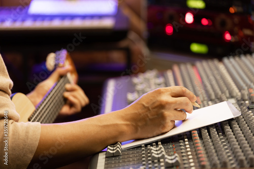 artist, guitar, acoustic, chord, education, lesson, practice, note, player, professional, occupation, hobby, panel, board, mixer, blank, music sheet, writing, writer, song, sound, audio, desk, mixing, studio, paper, lyric, crayons, songwriter, composer, male, man, guitarist, recording, music, musician, lifestyle, hand, person
