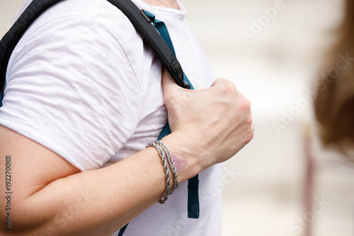 Male backpacker tourist holding backpack straps with his hands, hand and arm skin, close up, at Wat Arun.