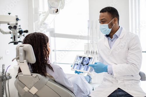 Male Black Dentist Doctor Demonstrating Female Patient Teeth Xray On Digital Tablet