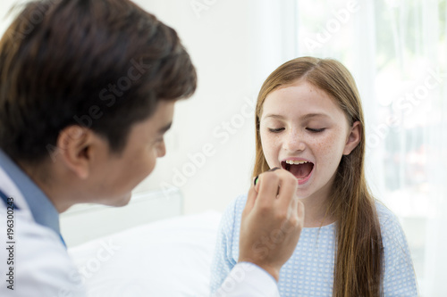 Male doctor examining girl mouth in clinic. People with health care and medical concept