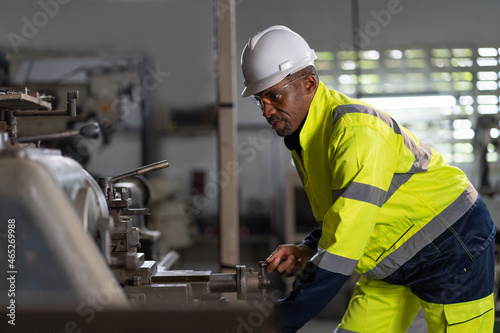 Male engineer worker maintenance heavy machine in the factory. Black male worker working with heavy machine with safety uniform, goggles and helmet
