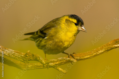 Male Eurasian Siskin perched on a twig in natural backdrop