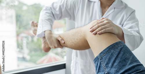 Male patients consulted physiotherapists with knee pain problems for examination and treatment. Rehabilitation physiotherapy concept
