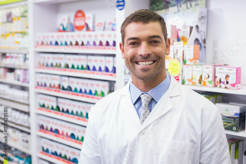 people, apothecary, pharmacy, medicine, health care, medicals, professionalism, retail, wellness, trust, male, white, adult, standing, smiling, labcoat, attaching, dress shirt, aisle, shelf, box, bottle, organised, product, display, colourful, chemist's shop, inside, posing, health, professional, healthcare professional, pharmaceutical, medication, copy space, bright
