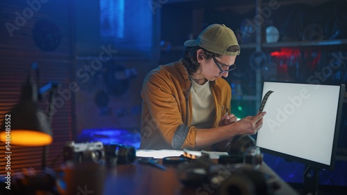 film, disrobed, stage, shooting, editor, photographer, man, workshop, room, work, camera, studio, creative, cinematography, filmstrip, photo, monitor, tool, equipment, lifestyle, light, table, lamp, hat, goggles, concentration, study, building, craft, technology, hobby, creativity, young, indoor, business, handiwork, to urbanize, desk, problem, solution, activity, task, engineering, experiment, skill, composition, projector, structure