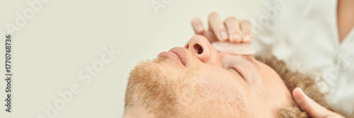 Male receiving relaxing facial massage with soothing stone, close-up of spa treatment for young caucasian.