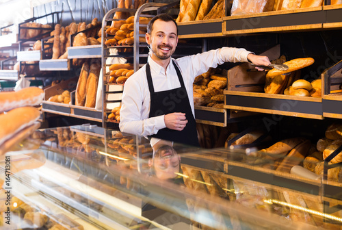 man, bakery, shop, store, indoor, seller, assistant, french, baguette, loaf, bread, baked, food, healthy, fresh, crispy, tasty, organic, homemade, diet, well-being, work, occupation, professional, retail, choice, showing, demonstrating, offering, young, adult, guy, male, 1, person, white, caucasian, european, smiling, cheerful, helping, selling, advising, variety, displayed, option