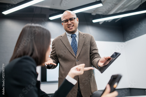 angry, filtered, stressed, man, coffee cup, talk, professional, woman, oneness, organisation, female, colleague, businesswoman, smiling, brainstorming, online, cyberspace, successful, graph, person, presentation, communication, brainstorm, teamwork, stronger, laptop, notebook, financial, team, leader, conference, business, arguing, frustrated, reject, mistake, disagreement