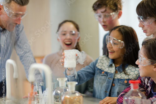 Male teacher and students watching chemical reaction, conducting scientific experiment in laboratory classroom