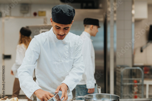 working, one person, europa, photo, front view, color image, preparation, high school, goteborg, horizontal, holding, learning, indoor, saucepan, chef, chef's hat, skill, smiling, apprentice, trainee, food and drink, food, cooking, cooking school, eatery, scandinavia, standing, sweden, teenage, occupation, practicing