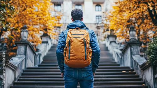 Male traveler with a yellow backpack gazes up the grand staircase, framed by vibrant autumn leaves, evoking a sense of adventure and exploration
