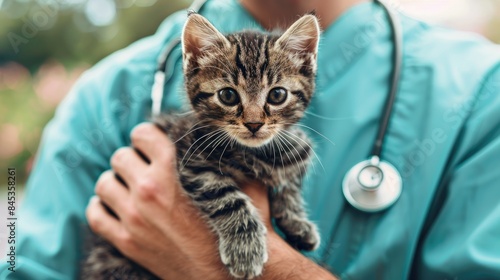 male veterinarian doctor with stethoscope holding cute fluffy striped kitten in arms in veterinary clinic