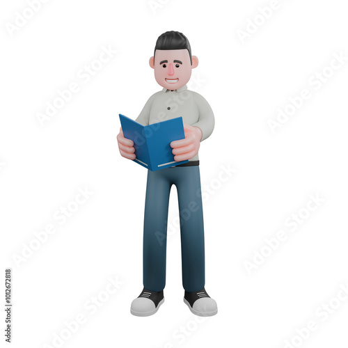 Male Writer Character. A male writer stands holding a blue book with both hands. 3D Storyteller
