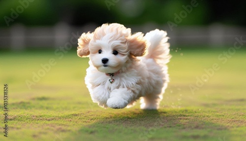 Maltipoo puppy running in grassy field