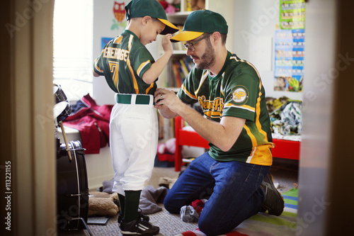 Man and boy preparing for baseball match