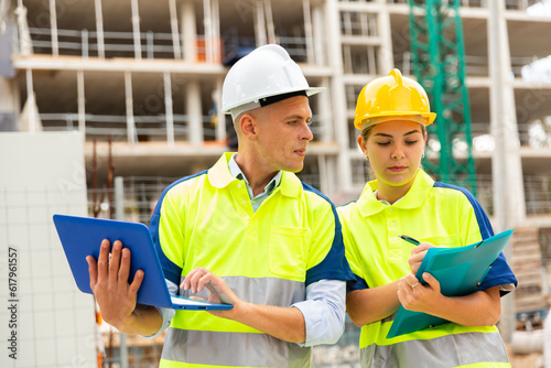 Man and woman builders in uniform and hardhats discussing while standing in construction site. Man using laptop, woman holding folder with documentation.