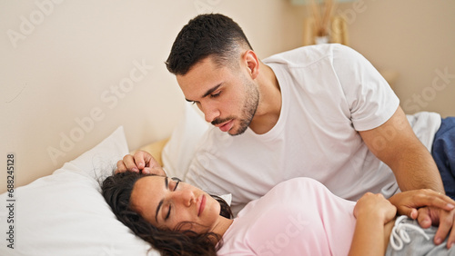Man and woman couple touching girlfriend head while sleep at bedroom