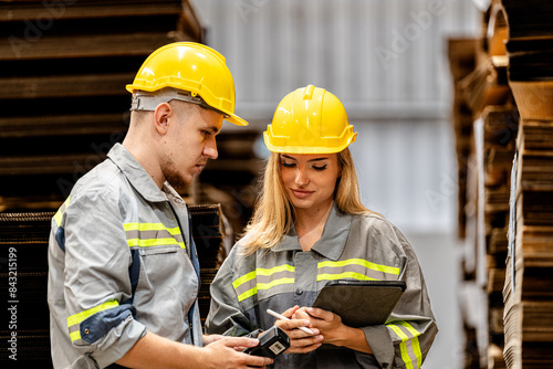 man and woman worker walking and checking stock for shipping. Female inspecting the store factory. Logistics employees holding folders at on site warehouse area for shipping transportation.