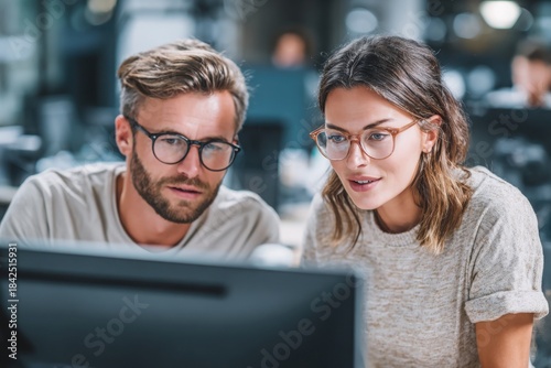 Man and woman working together at a computer screen in a modern office environment, engaged in a focused discussion or project.