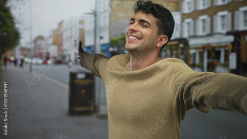 man, arm, stretch, hispanic, young, smiling, city, street, male, joy, happiness, carefree, travel, tour tourism, vacation, portrait, casual attire, sweater, beige, knit up, building, architecture, urban, pedestrian, freedom, expression, gesture, emotion, positivity, cheerful, leisure, wanderlust, adventure, sightseeing, exploring, journey, smile, bliss, warmth, horizon, scenery, boulevard, day, paseo, doorway, culture, holiday, relaxation