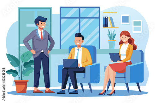 Man business chair sitting waiting businessman candidate recruitment office businesswoman woman businessperson job young interview line employee career row hall colleague modern flat design simple