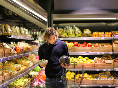 male, organic, vegetarian, apple, basket, buy, choosing, comparison, consumerism, convenience, client, dietary, dieting, eating, aubergine, examining, farm, farmer, food, fresh, freshness, fruit, fruit, green, grocery, grocery, healthy, holding, lifestyle, lose weight, man, market, merchandise, nutritional, pear, people, person, produce, retail, shop, store, supermarket, vegetable, vegetable