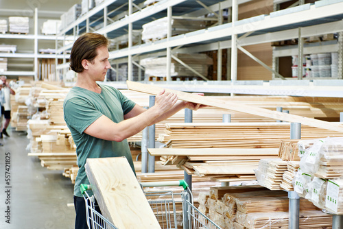 Man chooses and buys wooden boards in store