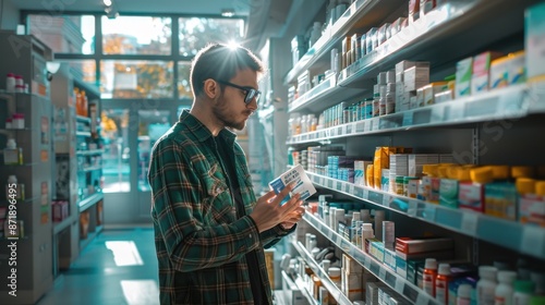 health care, man, young, pharmacy, shopping, lifestyle, medicine, professional, medicals, reading, shelf, goggles, medication, patient, store, indoor, client, serious, male, holding, inventory, shop, people, aisle, prescription, cardboard box, chemist's shop, product, retail, plaid, buying, choosing, adult, treatment, product, consumer, purchase, browsing, choice, commercial, illuminated, concern, selection, flannel