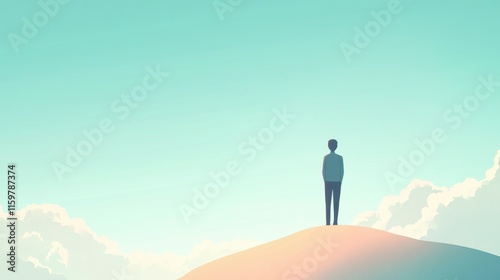 man, contemplating, hilltop, sunset, peaceful, scene, serene, sky, cloud, horizon, hope, freedom, minimalist, calm, tranquil, contemplative, solitude, view, background, design, graphic, artwork, pastel, colours, mood, atmosphere