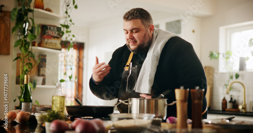 Man, cooking and smell food in home for lunch preparation, meal aroma and creative process. Private chef, scent and healthy ingredients for gourmet cuisine, dinner nutrition or dish progress at house