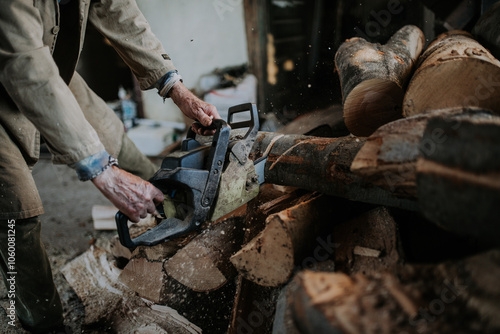 chain saw, cutting, dangerous, firewood, labor, male, manual labor, object, old man, person, sawdust, sharp, tool, preparing, winter, work, cut, serbia, 80s, one person, white