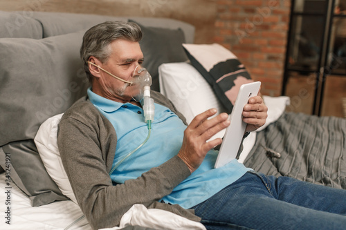 Man doing inhalation through oxygen mask at home bedroom and use laptop