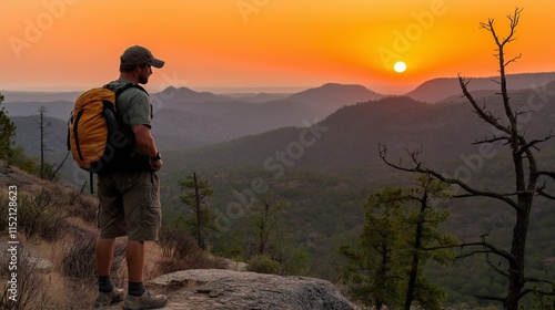 Man Enjoys Scenic View at Sunset While Hiking in Nature with a Backpack on a Rocky Outcrop, Surrounded by Mountains and Trees, Capturing the Beauty of the Outdoors