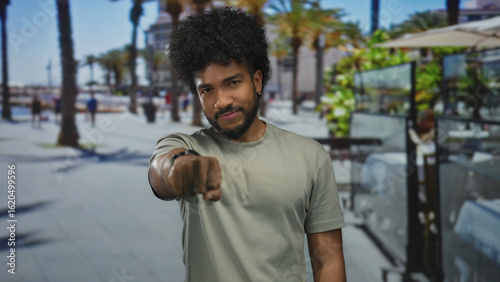 man, fist, eatery, terrace, palm, tree, lively, sunny, day, african, american, scene, gesture, urban, street, casual attire, fashion, expression, summer, daylight, signs, friendly, outdoors, people, male, background, tropical, clothing, camera, interaction, social, active, modern, city, public, sidewalk, lifestyle, afro, portrait, confidence, neutral, environment, location, context, relaxed, travel, vibe, setting