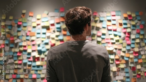 man, wall, note, sticky, colourful, idea, thinking, problem, solving, brainstorming, planning, vision, sharpened, back, grey, shirt, thoughtful, considering, creative, inspiration, colours, arrangement, pattern, room, design, concept, mind, cognition, solution, brain, strategy, innovation, future, effort, meeting, purpose