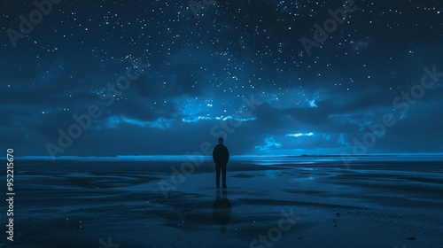 man, night, beach, sky, star, solitude, wonder, dream, contemplation, nature, serenity, ocean, water, coastline, horizon, calmness, peaceful, calm, dark, nightscape, astronomic, celestial, twilight, loneliness, awe, mystery, relaxation, blue, scenic, picturesque, outdoors, exploration, adventure, huge, emptiness, minimalist, gloaming, darkness, atmospheric