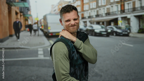 man, grimace, shoulder, urban, street, car, pedestrian, background, discomfort, city, pain, expression, arm, daylight, traffic, building, road, people, rushed, business, emotion, feeling, sidewalk, fashion, casual attire, beard, foulard, pavement, mobility, grey, green, action, pose, reaction, crowded, public, movement, tension, frustration, activity, energy, mood, style, scene, setup, dynamic, male, adult
