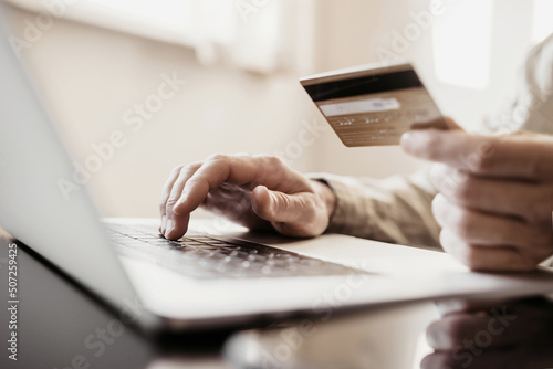 Man hand holding credit card and using laptop at home, Businessman or entrepreneur working, Online shopping, e-commerce, internet banking, spending money, working from home concept