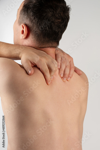 male, person, people, neck, spine, pain, hand, shoulder, massage, man, isolated, adult, medicals, healthy, health, stress, human, cramp, injury, hold, body, sick, back, caucasian, muscular, clinic, spinal, holding, arthritis, frustration, backache, pressure, disease, rear, health care, bruised, painfully, tension, painful, hair, head, skin