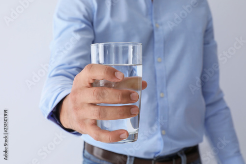Man holding glass of pure water on white background, closeup