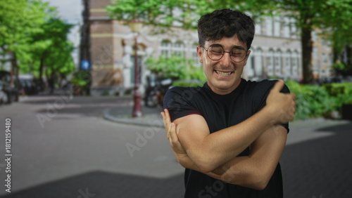 Man hugging his shoulders on a city street, holding upper arm across chest while grimacing; vulnerability awkwardness.